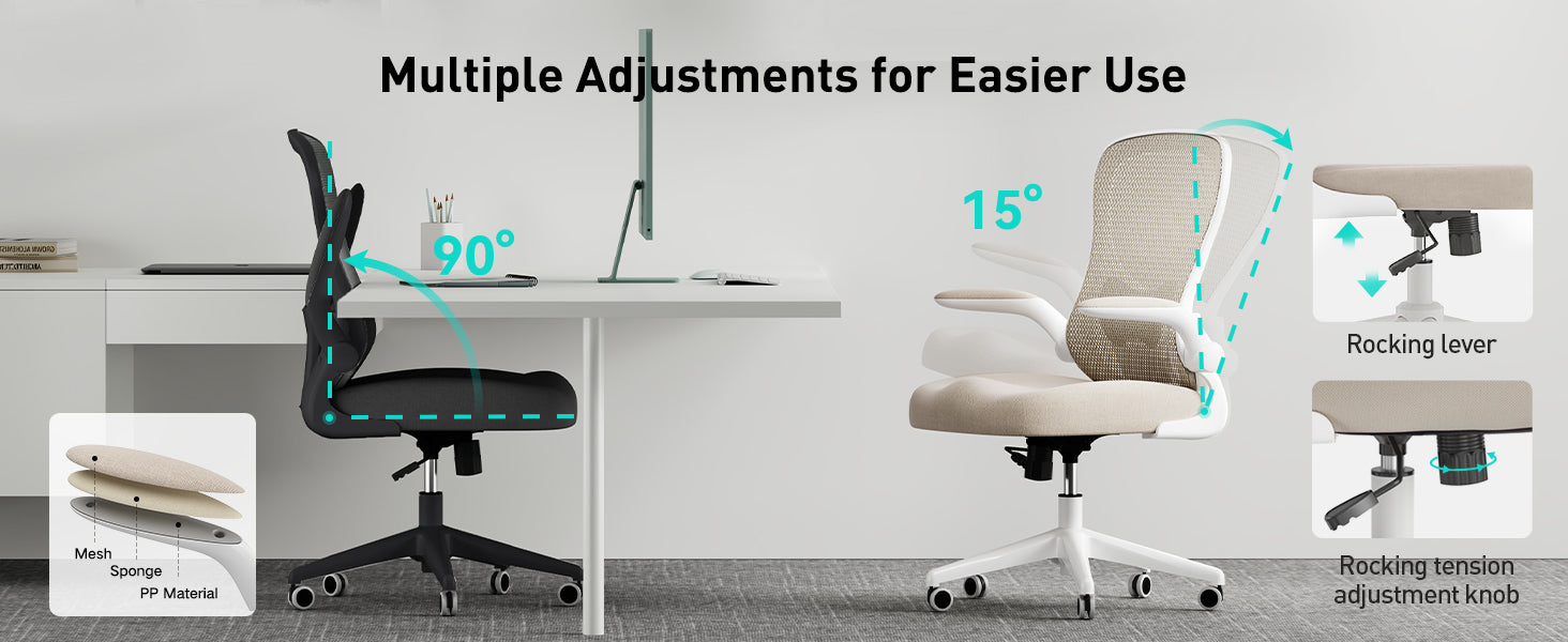 Flip-up Arms to meet different needs, you can push the office chair directly under the desk to use more area.